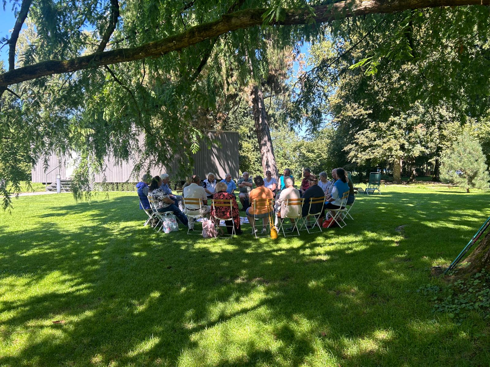 Der Garten des Schloss Hüningen ist eine Oase. Das satte Grün des Parks, die prächtigen Rosen, die grossen Bäume und das beruhigende Vogelgezwitscher – hier ist alles ein Augenschmaus und ein Hörgenuss.