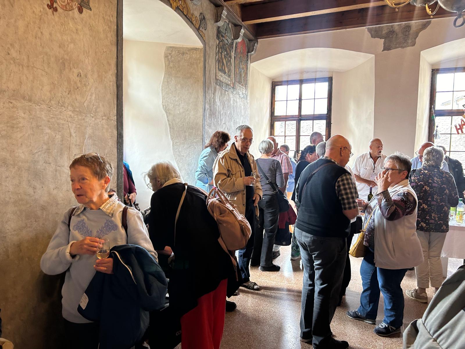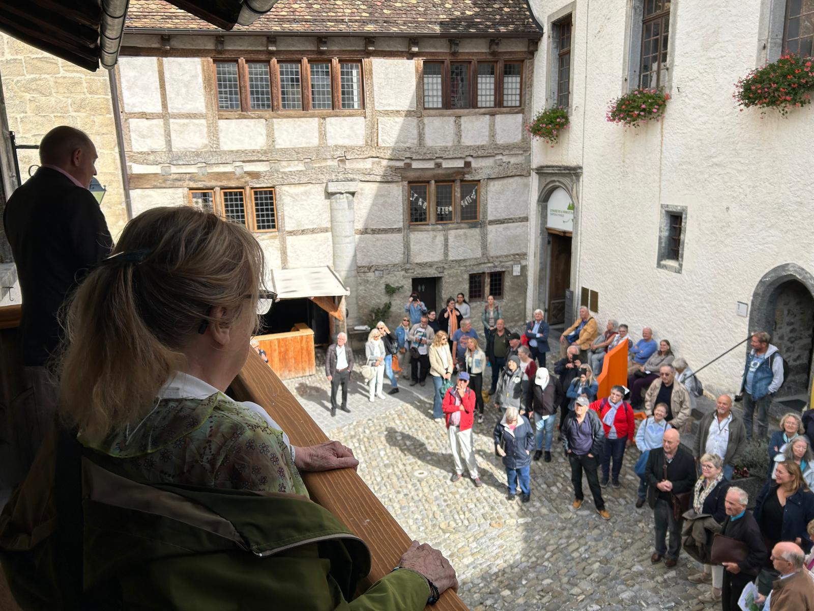 In seinen Begrüssungsworten würdigte Gemeinderat Stéphane Montangero die Arbeit des Erzählbistro und begrüsste die 70 Anwesenden im Namen von Aigle. Diese ehrenvolle Begegnung mit der regionalen Politik hatte unsere Annita organisiert, deren Engagement von allen mit einem kräftigen Applaus bedankt wurde. Anschliessend begab man sich auf eine Schlossführung und erfuhr allerlei Spannendes über diese ehemalige Residenz der Ritter von Aigle.
