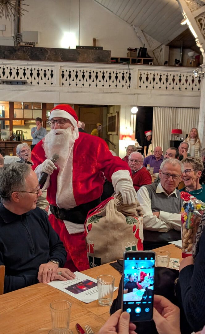 Beim Programm trat ein edler Spender auf, der erklärte, warum seine Firma dem Erzählbistro unbedingt einen Anlass spendieren will. Ebenso war Roland Holl auf der Bühne, der reimend das letzte Jahr Revue passieren liess. Es war ein Gaudi. Und schliesslich trat der spontan zusammengesetzte Erzählbistro-Chor auf, der mit dem Publikum festliche Lieder sang. Die Stimmung wurde immer besser und fröhlicher, wozu auch der Santa beitrug, der jedem Gast ein Säckchen mit Süssigkeiten mitgebracht hatte.
